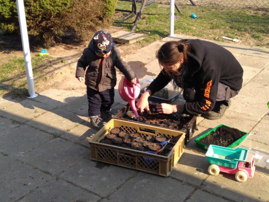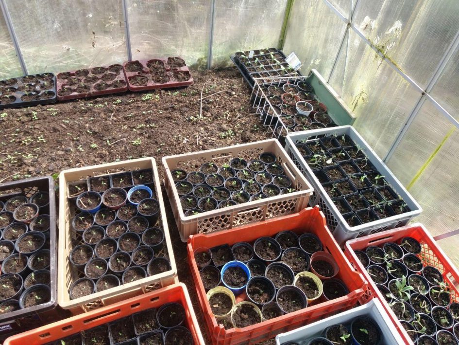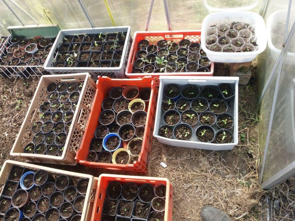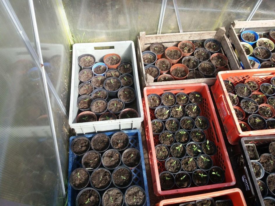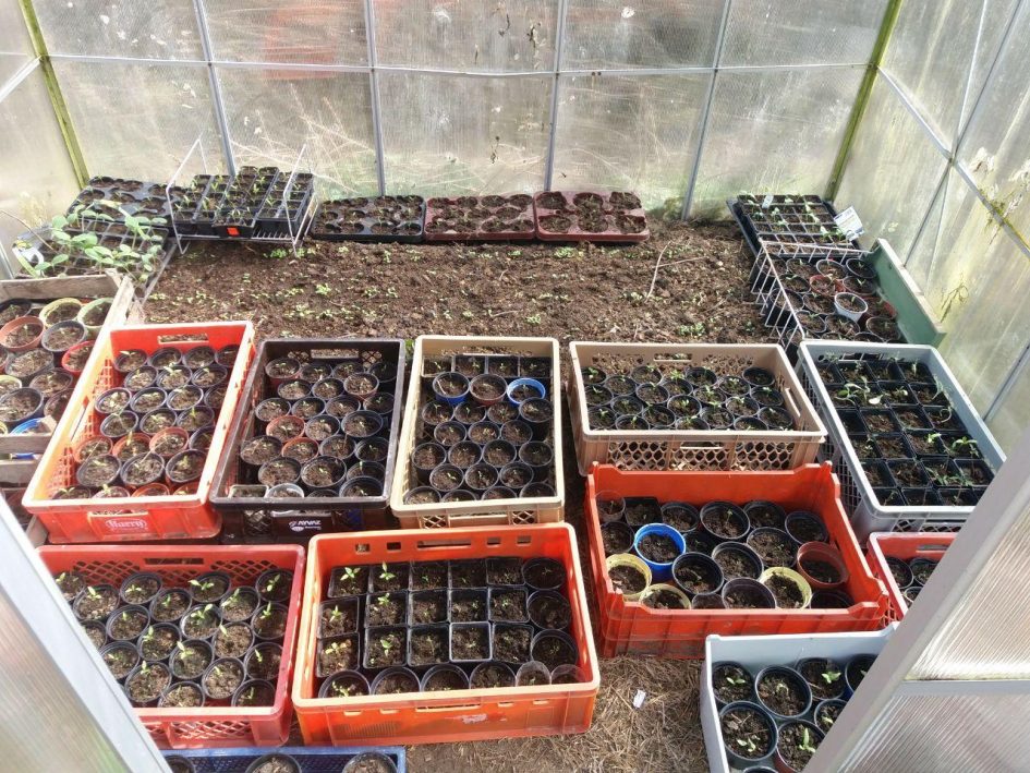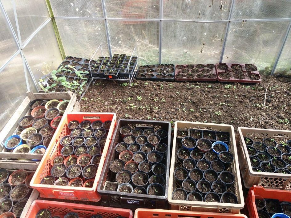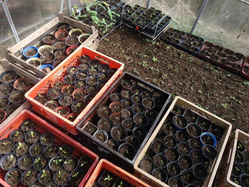 Mit professioneller Hilfe konnten wir jetzt schon fast alle unsere vorgezogenen Pflänzchen pikieren und in größere Töpfe setzen. Dementsprechend ist es jetzt sehr eng im Gewächshaus geworden: